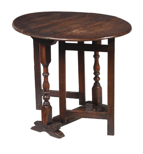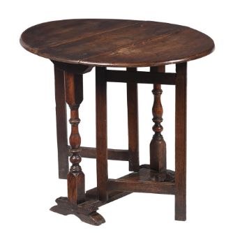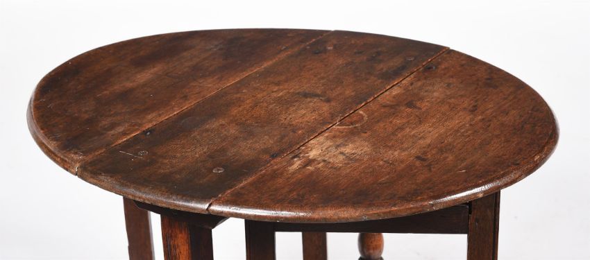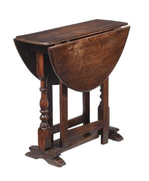 A WILLIAM AND MARY OAK GATE-LEG TABLELATE 17TH CENTURYOf small proportion, with oval top, square gates and baluster-end supports68 cm high, 84 cm wide (open), 71 cm deepCondition Report: Marks, knocks, scratches, abrasions consistent with age and useThe top with marks, stains, colour variation, some warping to the leavesSplits and cracks, openings to jointsSigns of woodworm overall especially to the lower portions and feetThere have been alterations to the hingesPlease see additional images for visual reference to condition  Condition Report Disclaimer