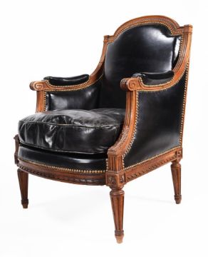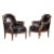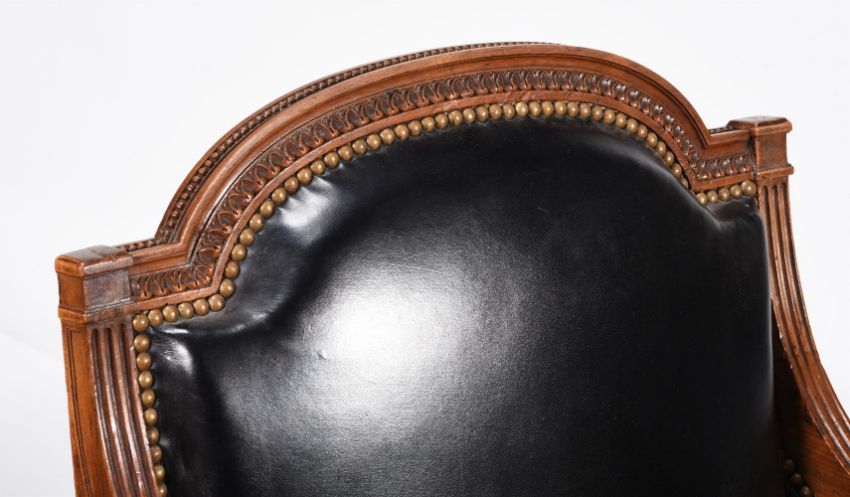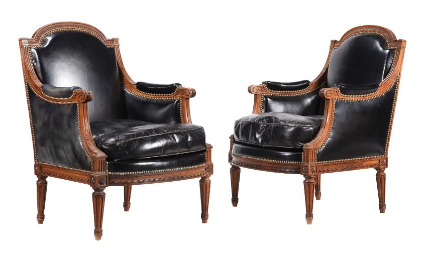 A PAIR OF CARVED WALNUT AND LEATHER UPHOLSTERED ARMCHAIRS IN FRENCH TASTEEARLY 20TH CENTURYEach 91cm high