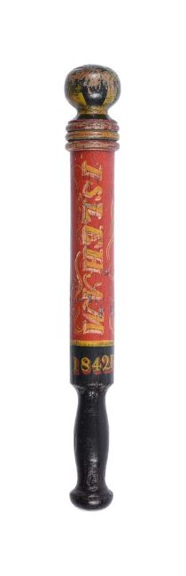 AN EARLY VICTORIAN DATED PARISH CONSTABLE'S TRUNCHEONDATED 1842With VR cypher and crown reserved on a red ground and named for the parish of ISLEHAM (Cambs.), 38.5cm longProvenance: The 'Constable' Collection of Truncheons and Tipstaves Part II.Condition Report: Some wear and paint loss.Condition Report Disclaimer