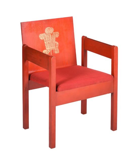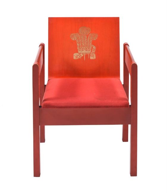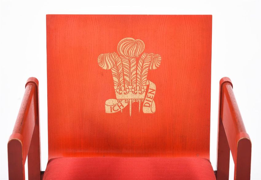 A RED PAINTED ARMCHAIR FROM THE INVESTITURE OF CHARLES, PRINCE OF WALESFIRST HALF 1969Designed by the Rt Hon. the 1st Earl of Snowdon, Carl Toms and John Pound, each red stained beach back gilt indented with Prince of Wales's feather motif, the seat upholstered in red Welsh tweed, stamped to underside77.5cm high, 54cm wideThe investiture of the previous Prince of Wales, Charles, was held at the Medieval Caernarfon Castle on 1st July 1969, following the ceremony the chairs were dismantled and offered for sale 'flat-pack', the attendant guest then had first refusal on their purchase, the remainder being offered to the public. Antony Armstrong-Jones, The 1st Lord Snowdon, who orchestrated the ceremony, purchased six for himself.Condition Report: Marks, knocks, scratches, abrasions consistent with age and useThe seat with some surface dirt and discolouration, There are chips and losses to the red paint to edges and corners, the armchairs arms are dirty and with marks, this would appear to have had frequent useOne screw is missing and the seat/back rises to the rear corner - this would benefit from replacementThere are recessed screws to the rails - these could probably be removed in order to break down, the dished seat is one piece, the remainder of the frame appears to be another piece - it may be the remaining joints are glued in place, Dreweatts make no guarantees and have never tried to dismantle a chair to testPlease refer to additional images for visual reference to conditionCondition Report Disclaimer