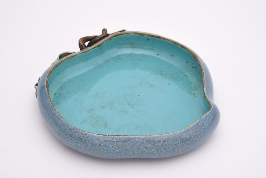 A Chinese robin's egg glazed 'Peach' washer, 19th century, Qing Dynasty, 23cm wide晚清 炉钧釉桃型笔洗Condition Report: minor wear to the surfaceCondition Report Disclaimer