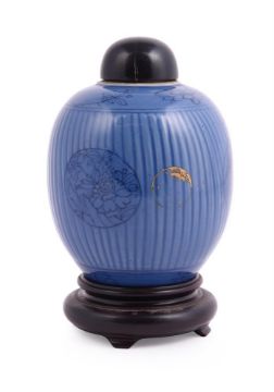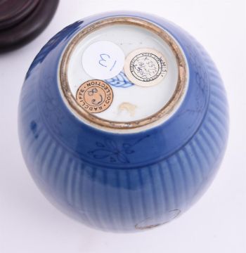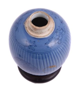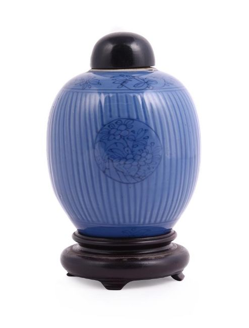 A Chinese porcelain blue glazed jar, Kangxi, circa 1700, incised and painted, the base with underglaze blue artemisia leaf mark, with labels for Radcliffe collection, 'C8', Sydney Moss and with traces of BADA label, the jar approximately 12.5cm high, wood cover and standProvenance: Major Edward Copleston Radcliffe (1898-1967) collection prior to 1967 and listed in the family archive, 'C8', as at one time with Sydney L. Moss Ltd, London清康熙 蓝釉莲子罐拍品来源:Edward Copleston Radcliffe (1898-1967) 少校私人收藏(家族档案编号C8),1967年前购自英国著名古董商Sydney L. MossCondition Report: in good condition other than minor firing blemishes and small surface scratcheslater wood cover with shrinkage crack Condition Report Disclaimer