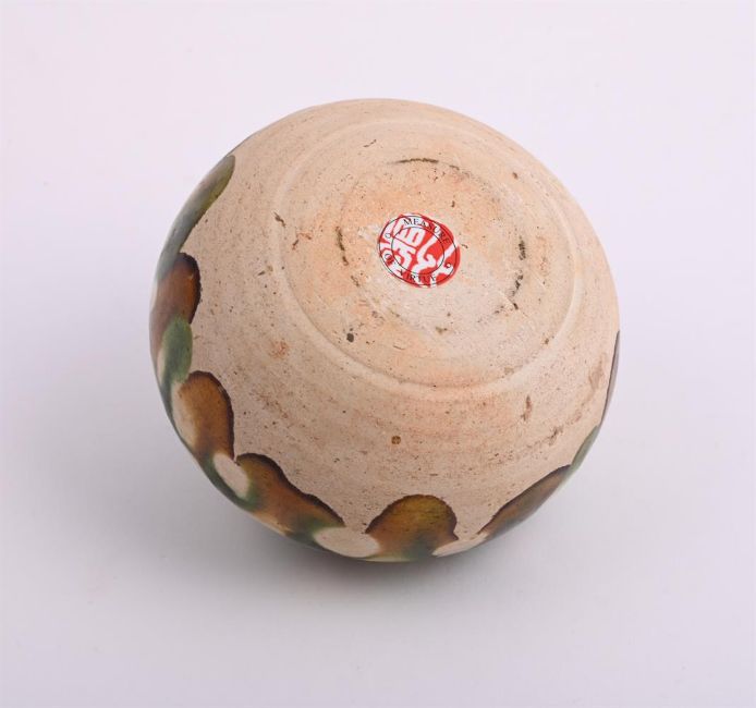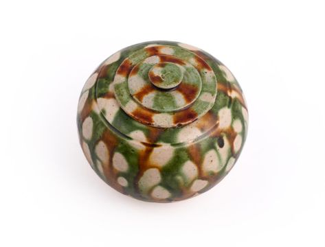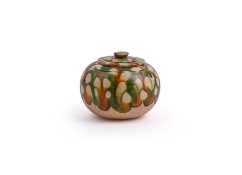 An attractive small Chinese sancia-glazed jar and cover, Tang (618-907), with a potting groove encircling the shoulder and slightly incurved mouth, splashed in amber, green and cream glazes leaving the lower part and foot unglazed, the cover with knop finial similarly glazed, 6.5cm high x 8cm wide Sometimes known as 'apple' jars because of the shape and referred to as 'medicine jars' by W. Watson, Tang and Liao Ceramics, 1984', p. 195, pl. 159. Compare the very similar jar and cover illustrated in the catalogue for the exhibition, Zui to no bijutsu, Osaka Municipal Art Museum, 1976, p. 8, no. 1:25唐 三彩小罐Condition Report: minor glaze flakes to lid rim Condition Report Disclaimer