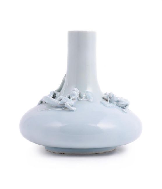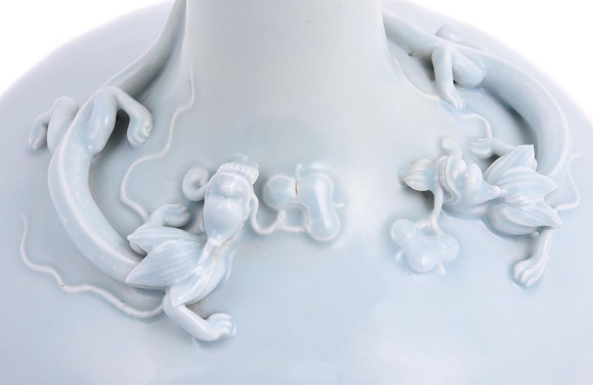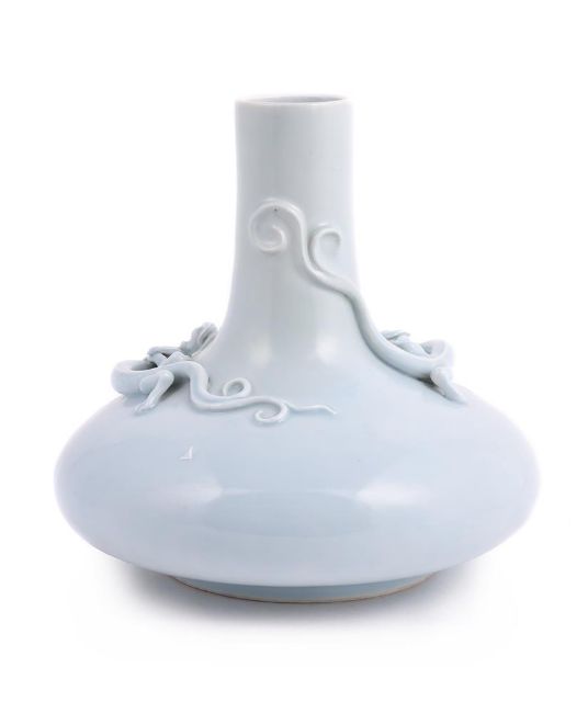 A Chinese clair-de-lune glazed bottle vase, Qing Dynasty, applied to neck and shoulder with a pair of crawling chilong dragons, 25.3cm high清 月白釉浮雕螭龙纹荸荠瓶Condition Report: neck with cracks and restoredCondition Report Disclaimer