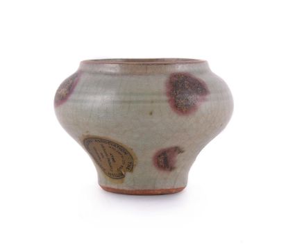 A small Chinese Jun-type purple-splashed glazed celadon jarlet, Yuan or Ming Dynasty, of inverted baluster form with double incised line towards top of vase, the whole with fine crackle glaze and purple, brown and black splashes, label for Radcliffe collection and BADA, 5.3cm high x 7.5cm wide Provenance: Major Edward Copleston Radcliffe (1898-1967) collection and listed in the family archive, 'A27', as purchased from Sotheby's in 1945, for £18-0s-0d元至明 青釉小罐拍品来源:Edward Copleston Radcliffe (1898-1967) 少校私人收藏(家族编号A27),1945年购自苏富比 Condition Report: crack from neck down into body and neck groundCondition Report Disclaimer