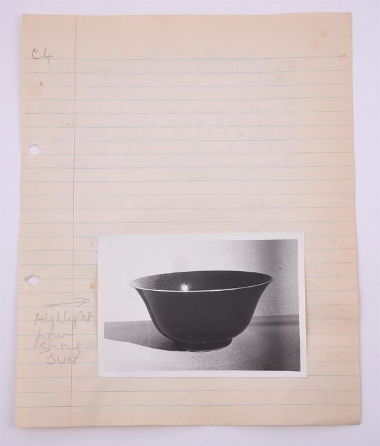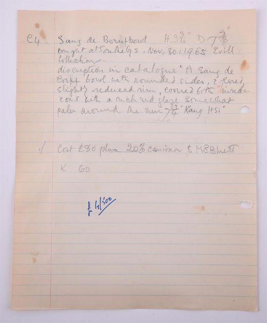 A Chinese copper-red bowl, Kangxi, on short foot with flared rim, with crushed strawberry veined glaze, flared rim, the base glazed in white, label for Radcliffe Collection 'C4', 20.5cm diameter, wood standProvenance: Frank Partridge where acquired by Nairne Stewart-Sandeman Christies, The Collection of Nairne Stewart-Sandeman, of Kenly Green, St. Andrews, Fife, May 22nd, 1954, lot 74, purchased by Bluetts for £42.00, and then sold to Harold Esslemont on the same day. Later sold by Harold Esslemont back to Bluetts, December 2nd, 1958, and then bought from Bluetts by Wilfred Evill, April 8th 1959 for £55.00Major Edward Copleston Radcliffe (1898-1967) collection and listed in the family archive, 'C4', as purchased on behalf of Major Radcliffe by Bluett & Sons, from the Evill Collection, Sotheby's, 30th November 1965, lot 60, for £80.00清康熙铜红釉碗拍品来源:Edward Copleston Radcliffe (1898-1967) 少校私人收藏(家族编号C4),1965年11月30日由英国著名古董商Bluett & Sons代理,以80英镑购自苏富比Evill收藏,拍品编号60。本碗最早于1954年5月22日由佳士得于Nairne Stewart-Sandeman专场售出,拍品编号74号,并为Bluett以42英镑所购,并于当日售于Harold Esslemont。之后在1958年12月2日又被Bluett购回,在1959年4月8日售于Wilfred Evill Condition Report: rim ground, piece filled to rim exterior 8mmx 7mm and crack through base extending up into foot about 12cm long Condition Report Disclaimer