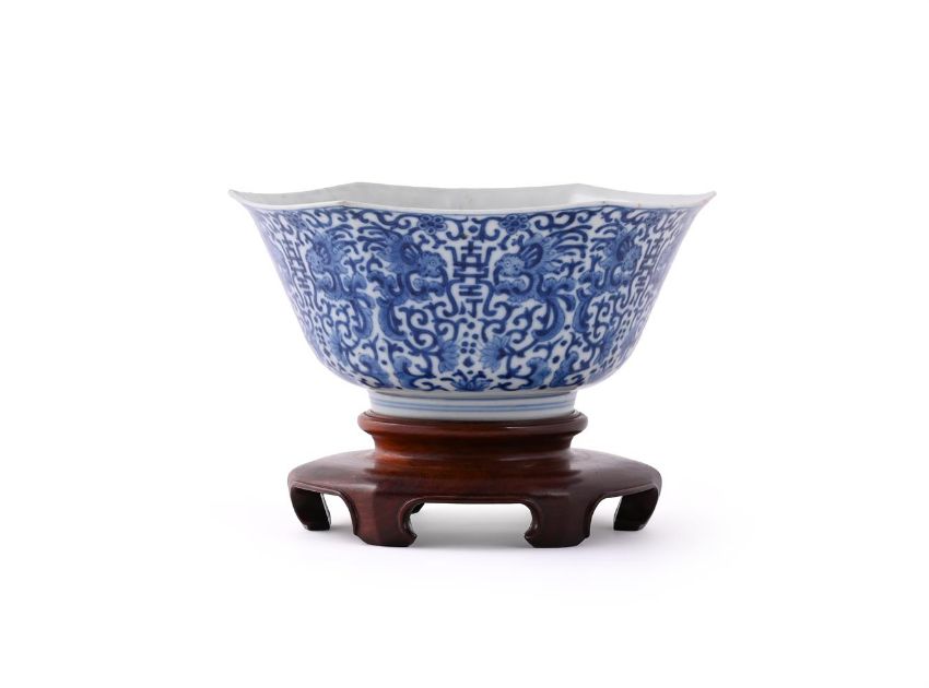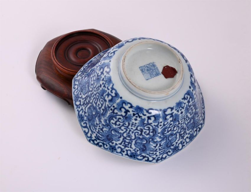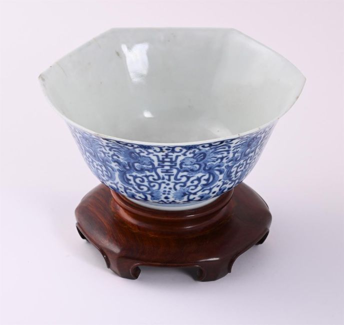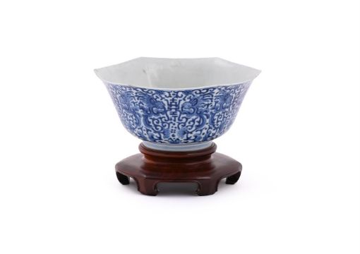 A Chinese blue and white hexagonal bowl, Qing dynasty, decorated to the exterior with shou character and follower foliage, the base inscribed with a six-character Jiaqing mark in underglaze blue, 17cm diameter (2)清 "大清嘉庆年制"款青花福寿花卉纹六方碗带木底座Condition Report: Three short cracks to the rim, approximately 1.5cm, 1cm and 5mmone chip on the base, approximately 2mm x1mmCondition Report Disclaimer