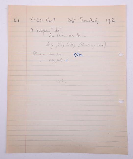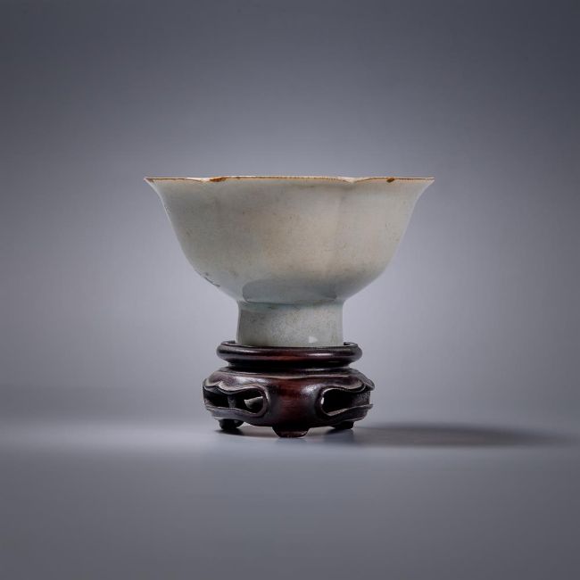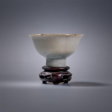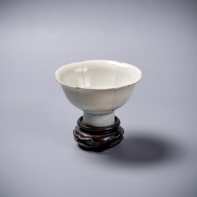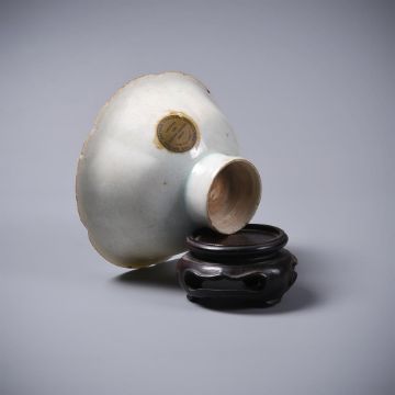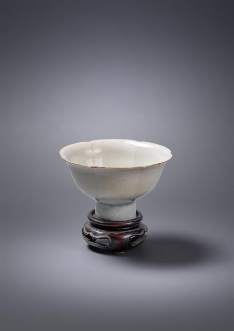 A Chinese Qingbai stem cup, Song Dynasty, the rounded sides divided into six lobes, supported on a tubular stem, covered overall in a transparent bluish white glaze, the underside of the foot ring unglazed revealing the body, labels for Radcliffe collection 'E1', and BADA, 6.8cm high x 11.5cm wideProvenance: Major Edward Copleston Radcliffe (1898-1967) collection and listed in the family archive, 'E1', as purchased from Sotheby's in 1931 for £4-10s-0d宋 青白釉莲瓣高足盃拍品来源:Edward Copleston Radcliffe (1898-1967) 少校私人收藏(家族档案编号E1),1931年购自苏富比Condition Report: old gold lacquer chips repaired to rim and other minor rim chips and foot rim chip and surface scratches and wear Condition Report Disclaimer