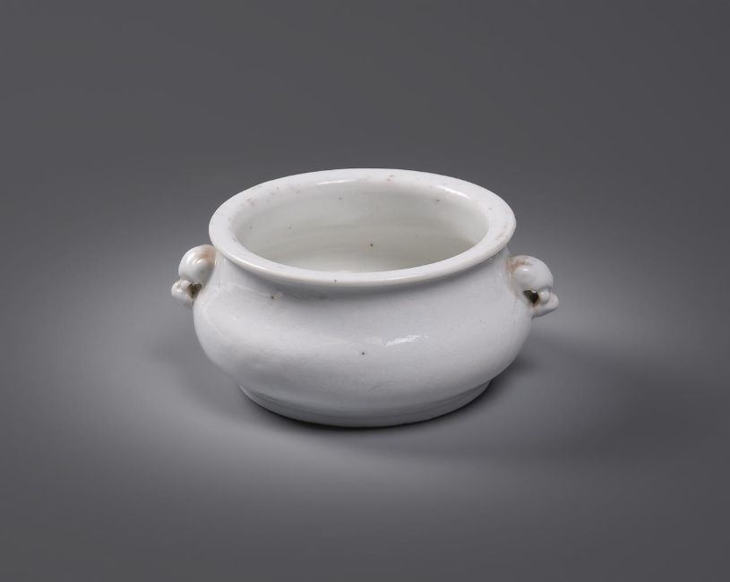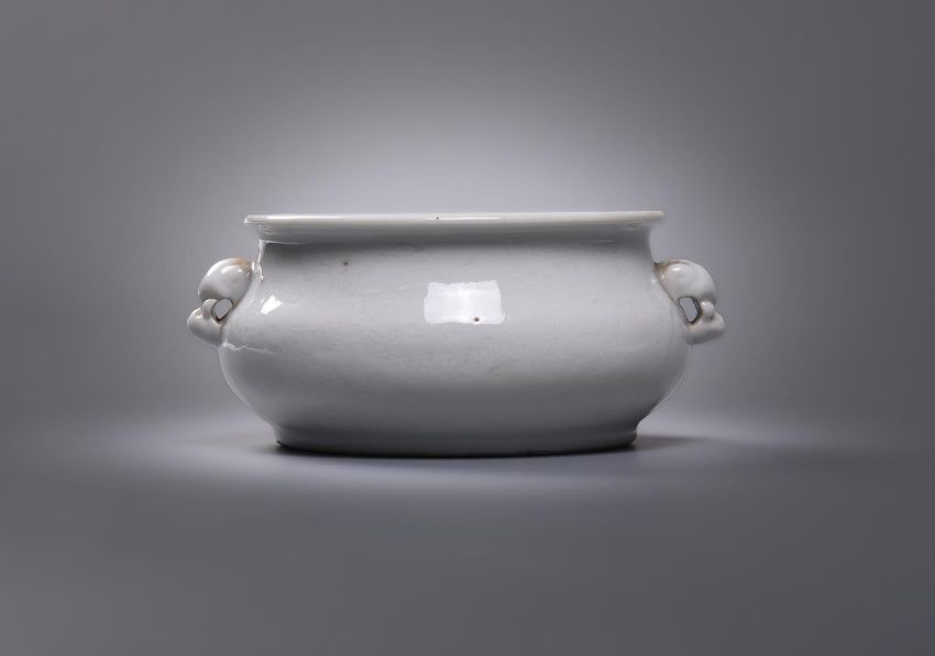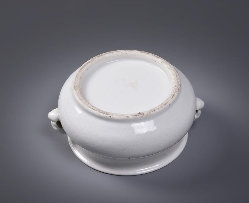 An unusual Chinese Dehua censer, gui, Qing dynasty, 18th century, incised to the exterior with dragons chasing the flaming pearl amongst clouds, with Buddhistic lion handles, 12.5cm diameterProvenance: Bought approximately 25 years ago by the current owner in the UK. 清18世纪 德化白釉暗刻龙纹炉  Condition Report: in good condition other than firing blemishesCondition Report Disclaimer