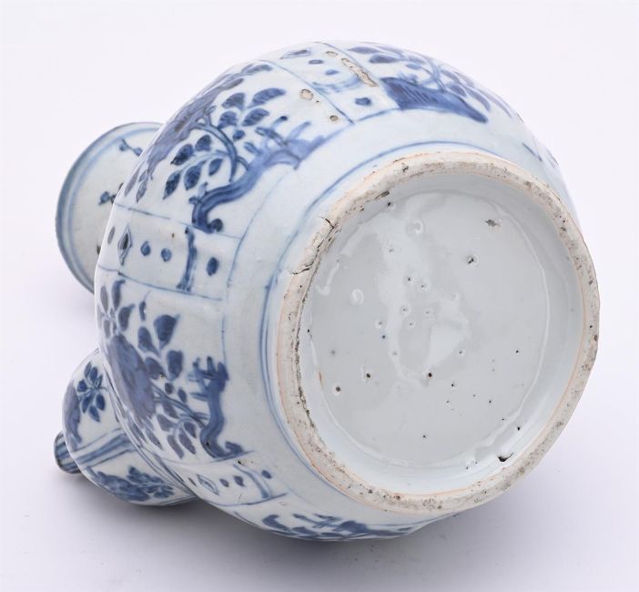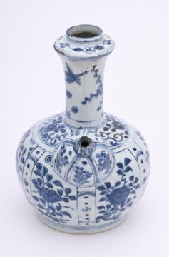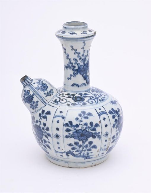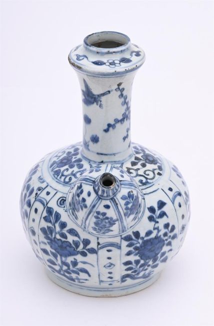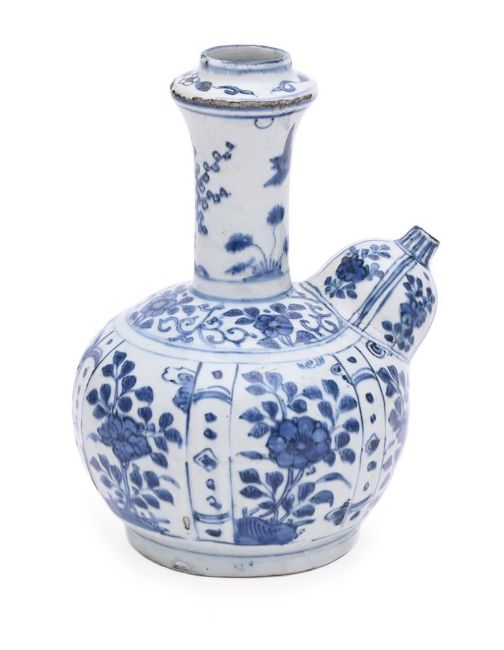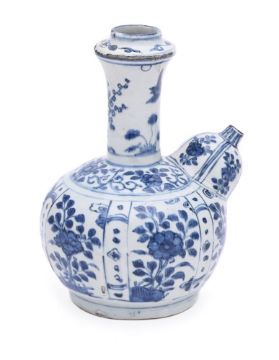 A Chinese blue and white Kendi, Wanli (1573-1619), painted with panels of flowers to the body and the neck with flowering prunus and a bird, 22.5cm high Provenance:The Wodehouse, Wombourne, Staffordshire.明万历 青花花卉纹军持拍品来源: 英国斯塔福德郡乡村大宅(The Wodehouse)Condition Report: some fritting to glaze on neck rim and outer rim small chip to spoutsome fritting to glaze on the body some firing cracksCondition Report Disclaimer