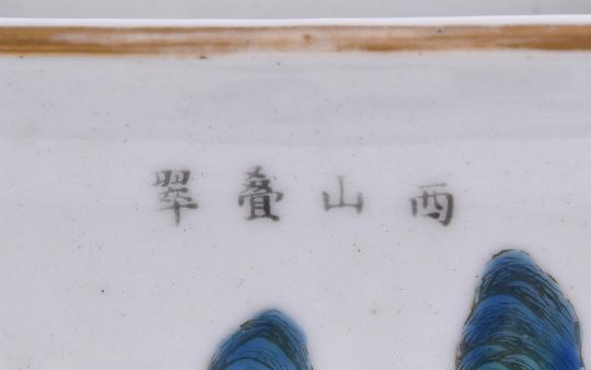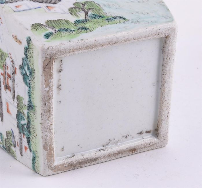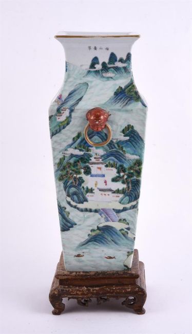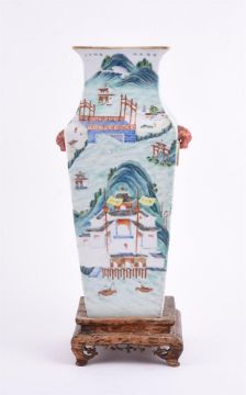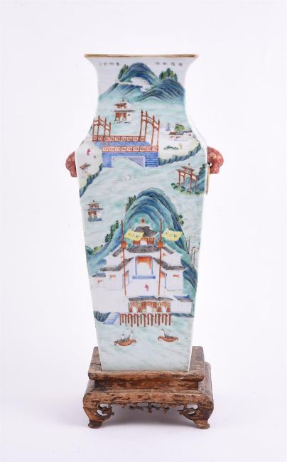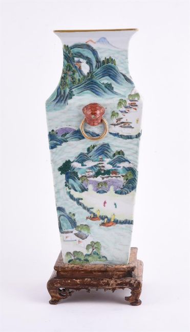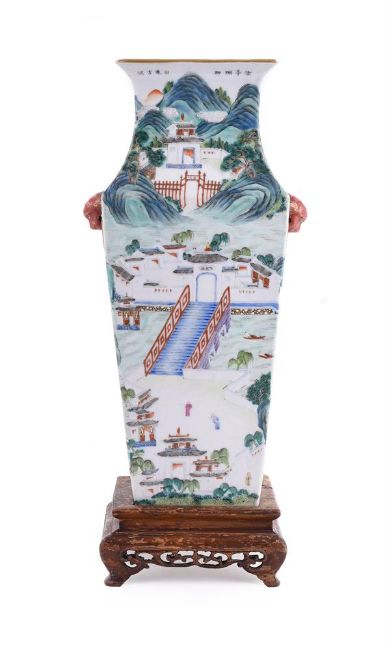 A Chinese famille rose square vase, 19th century, with everted rim and the body painted with a continuous riverscape scene, under the rim inscribed in ink with names of five different scenic sites in Jiangxi Provence, 37cm high, with wooden base清19世纪 粉彩江西十景图方瓶Condition Report: the vase with minor wear to the enamel and the foot with a shallow chip of 2.5cm, star crack to the interiorCondition Report Disclaimer