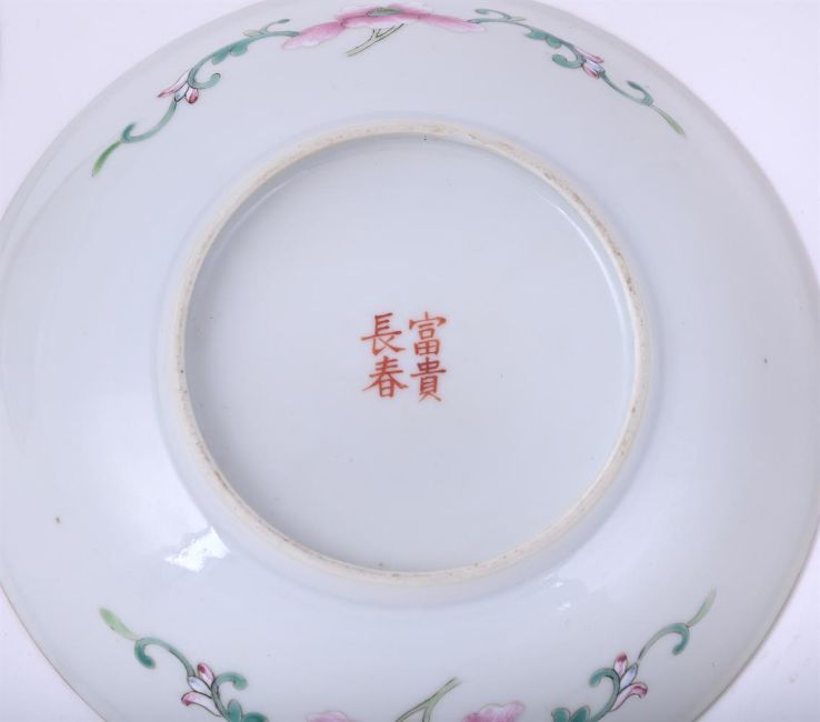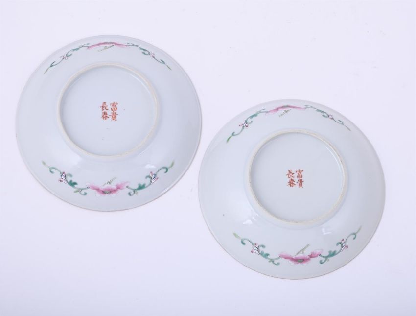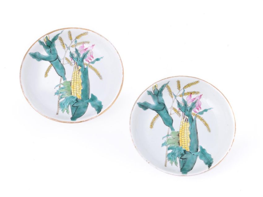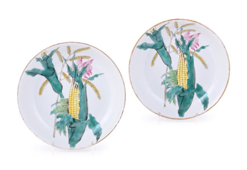 A pair of Chinese Famille Rose 'Sweet Corn' plates, 19th century, the base inscribed with a four-character fu gui chang chun mark, 14.2cm diameter (2)清19世纪 粉彩"富贵长春"款丰收图盘一对Condition Report: minor wear to the gilding on the rimCondition Report Disclaimer