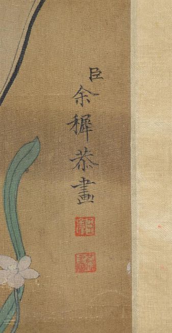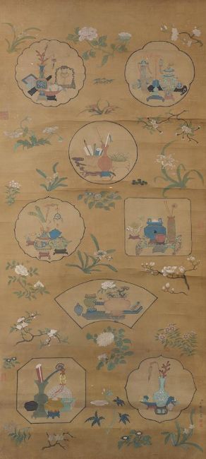 In the style of Yu Xigong (Qing Dynasty), Antiquities, ink and colour on silk, signed and with three seals of the artist, scroll, picture size 148cm x 63cm余樨恭(款)《清供图》设色绢本 卷轴Condition Report: paper with creasing and minor water stainsCondition Report Disclaimer