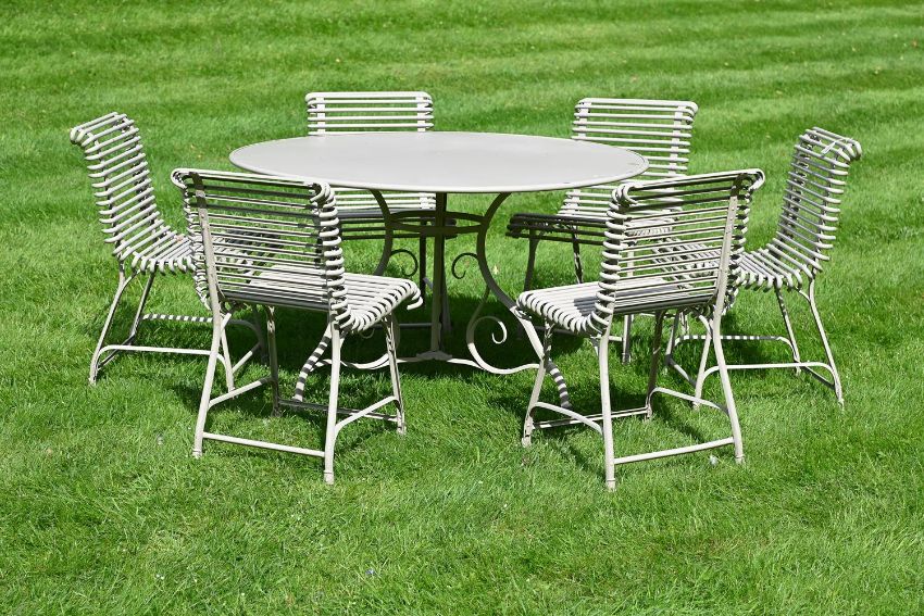 A SET OF GARDEN FURNITURE COMPRISING A CIRCULAR TABLE AND SIX CHAIRSMODERN, ATTRIBUTED TO ARRAS FURNITUREThe table 73cm high, 121cm diameter, each chair 79cm highCondition Report: Painted surface is later, this has rubbing, scratching, chips through the top later revealing the metal below, there are also signs of age and use in an exterior setting including surface dirt and deposits, some discolouration All elements appear solid and stable overallPlease see additional images for visual reference to conditionCondition Report Disclaimer