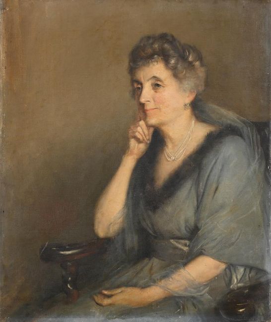 TOM ROBERTS (AUSTRALIAN 1856-1931)PORTRAIT OF MARY LUSHINGTON BERNARD D'OYLY, WIFE OF A. F. BERNARD OF COMBE RALEIGH, HONITON AND DAUGHTER OF SIR CHARLES D'OYLY, BARTOil on canvasSigned and dated '1921' (lower left)76 x 63cm UnframedProvenance:Marjorie Churchill, daughter of the sitterThence by descent to the current ownerThomas William (Tom) Roberts (1856-1931) was born in Dorchester, Dorset, but migrated to Melbourne in 1869. Roberts was the first major Australian painter to be selected to study at the Royal Academy of Arts which he attended from 1881 to 1884, where he was strongly influenced by painters such as James Abbott McNeill Whistler, Jules Bastien-Lepage and his followers in Newlyn and Glasgow, as well as other plein air artists which Roberts met on a tour of Spain in 1883. After returning to Melbourne in 1885 he was at forefront of the development of Australian impressionism, becoming one of the founding members of the Heidelberg School. Working alongside Frederick McCubbin, Arthur Streeton and Charles Conder, he attempted to capture Australia's light, heat and the special character of the Australian landscape with the same plein air principles imbued with a sense of nationalism. Roberts would return to England in 1903, keeping a studio in London for nearly twenty years before finally returning to Melbourne in 1923. From London he would make several excursions from Lake Como to Dorset, and in The Oil Paintings of Tom Roberts in the National Gallery of Australia (NGA, Canberra, 1997) Dr. Mary Eagle, noted that 'In the third week of August [1921] he went to Combe Raleigh, near Honiton in Devon, to paint a portrait of Mrs B D'O', which she now believes to be the present portrait of Mary Lushington Bernard D'Oyly (private communications 28 April 2023). In a letter to Roberts' wife dated 24th of August that year, he includes a little sketch of the portrait and mentions 'The colour is a good pale blue on Gold B'ground'. He also relates: 'I haven't written as there was no news, except I wasn't getting on too happily with the portrait - I've got hold of it now & it goes well - There is much difficulty in working in an ordinary room - one gets jammed up, the light deceives one - when the place is not spacious & you are right against the window. They are very pleased & there is the best to go into it yet. They are off to Exeter, motoring to some races, the daughter in something dark the mother my sitter very spring like & lace & pearls.' (Mitchell Library, State Library of New South Wales, ML MSS 4586 2(2) transcribed by Dr. Mary Eagle). As with so many artists, portraits were Roberts' bread and butter, but his portraits of contemporary figures were no less important than his landscape and subject pictures. 'Not only are many of his portraits important records of notable figures, but a great number of them are also fine examples of Roberts' skill and individuality as a portraitist. His portraits of women in particular show great flair.' (Helen Topliss, Australian Dictionary of Biography, Volume II, 1988, online version 2006 and Helen Topliss, Tom Roberts 1856-1931: A catalogue raisonné, Vol. I. p. 21).Mary Lushington was born in 1856 in Meerut, Uttar Pradesh, India to Emelie Jane Nott (1834-1857) and Major-General Sir Charles D'Oyly, 9th Bart. Of Newlands, Blandford, Dorset (1822-1900). In 1877 she married Arthur Francis Bernard, J.P. (1850-1915), of Combe Raleigh, by that time Hon. Lieutenant-Colonel of the West Somerset Yeomanry Cavalry, which he joined in 1876 after serving with the Royal Welsh Fusiliers in the Ashanti War and retiring with the rank of Lieutenant in 1875. Together they had five children, Henry D'Oyly, Ruth Capel, Charles Camplin, Muriel Awdry and Marjorie Churchill. We kindly thank Dr. Mary Eagle, former senior curator of the National Gallery of Australia, for her help in preparing this catalogue entry.
