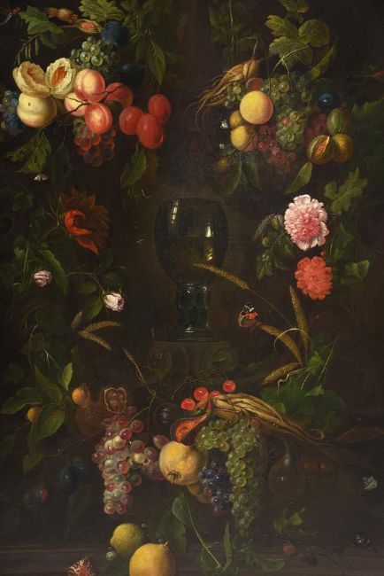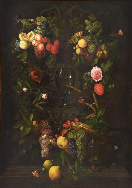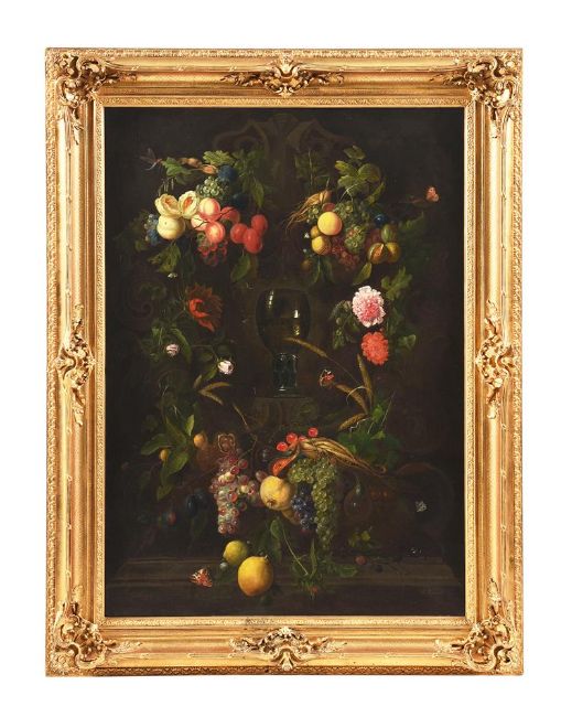 A ROEMER WITH A GARLAND OF FLOWERS AND FRUIT ON A LEDGE