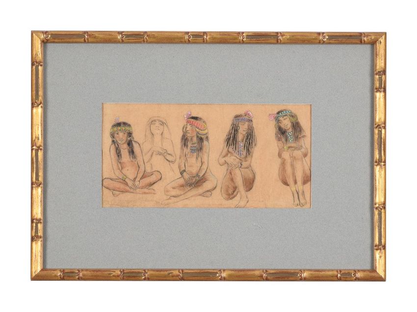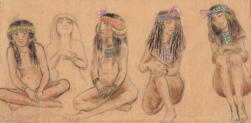 GEORGE ROCHEGROSSE (FRENCH 1859-1938)FILLETTES EGYPTIENNESPencil, gouache and watercolour With studio stamp (on the reverse of the backboard)15 x 30cm (5¾ x 11¾ in.)Provenance:Marambat-Malafosse Atelier Rochegrosse, Toulouse