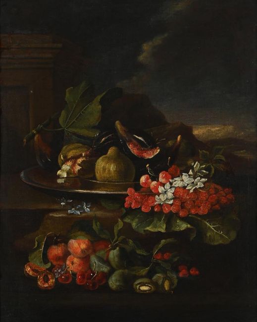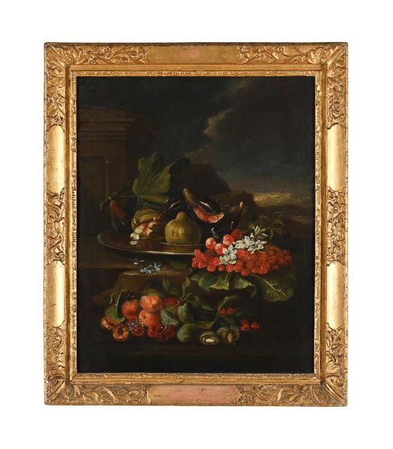 ITALIAN SCHOOL (17TH CENTURY)A STILL LIFE OF FRUIT AND FLOWERS ON A LEDGEOil on canvas65 x 52cm (25½ x 20¼ in.)Provenance:The Collection of Major General Sir Allan Adair, Flixton Hall, SuffolkThence by descent to the current owner