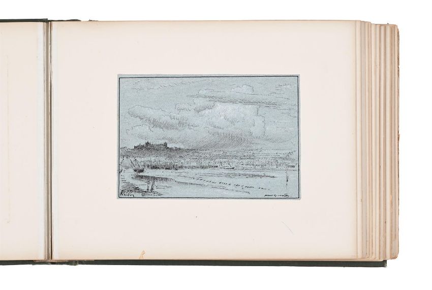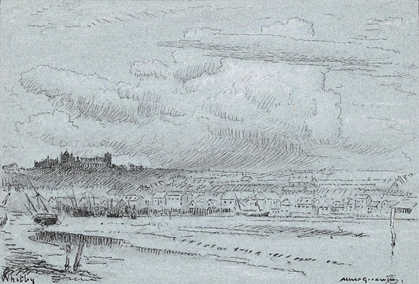 ALBERT GOODWIN (BRITISH 1845-1932)WHITBYPen and ink, white chalk on blue paperSigned (lower right) and inscribed as titled (lower left) 18 x 26.6cm (7 x 10¼ in.)UnframedProvenance:Davis Green, and by descent