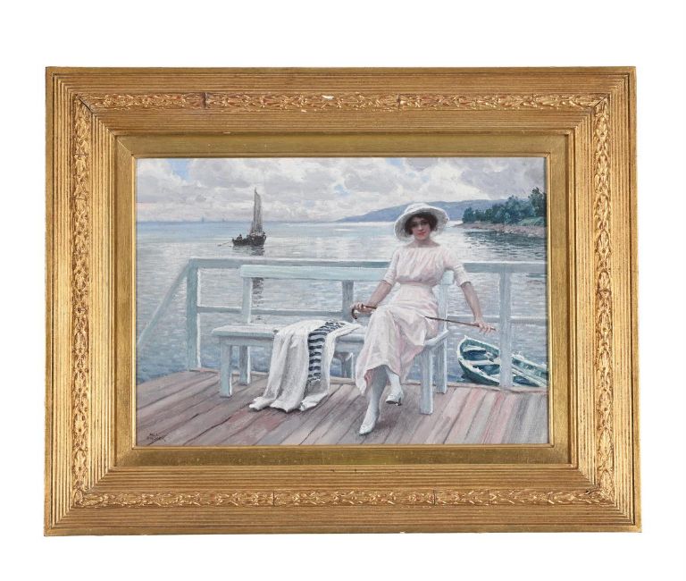 PAUL FISCHER (DANISH 1860-1934)ON THE JETTYOil on canvasSigned (lower left)38 x 53.5cm (14¾ x 21 in.)Provenance:Anthony Mitchell Fine Paintings, Nottingham, October 1986Paul Fischer's formal art education lasted a short while, studying at the Royal Danish Academy of Art in Copenhagen for only two years. He was largely taught by his father, who was a painter himself before turning to the manufacturing of paints and lacquers later on in his career. From 1884-1902 Fischer regularly exhibited at Charlottenborg's Spring Exhibition, but as he became increasingly well-travelled, painting in Scandinavia, France and Italy, he also exhibited all over Europe, notably in the Paris Salon. Staying in Paris from 1891-1895, he studied the works of the French Impressionists which would influence his harnessing of light on his return to Copenhagen.While Fischer's early works depict the intricate city life of Denmarks's capital - Fischer quickly gained renown as 'Copenhagen's painter' (Københavns maler) - from 1890 he also turned his attention to tranquil beach and lake scenes, a real juxtaposition to his crowded depictions of the hustle and bustle of the city. These included bright, sunny bathing scenes at Hellerup and Løkken, as well as elegant ladies looking out in thought over the waters of Båstad, Falsterbo and Hvalstad in Sweden. Indeed, the beach was becoming an increasingly popular place for Danish artists to depict. From the 1870's a group of Scandinavian artists known as the Skagen Painters even developed an artist's colony at Skagen, a popular tourist destination whose scenic nature and local milieu inspired many to paint en plein air in emulation of the French Impressionists. Condition Report: The canvas has not been lined. Fine craquelure scattered throughout, with two heavier areas to the right of the sitter, and to the sea left of the jetty edge (both visible in catalogue and online illustration). The paint in these areas is not flaking, but may benefit from stabilisation in order to prevent future lifting. Otherwise the work appears to be in good original condition. Inspection under UV reveals no evidence of retouching or repair. Unexamined out of glazed frame.   Condition Report Disclaimer