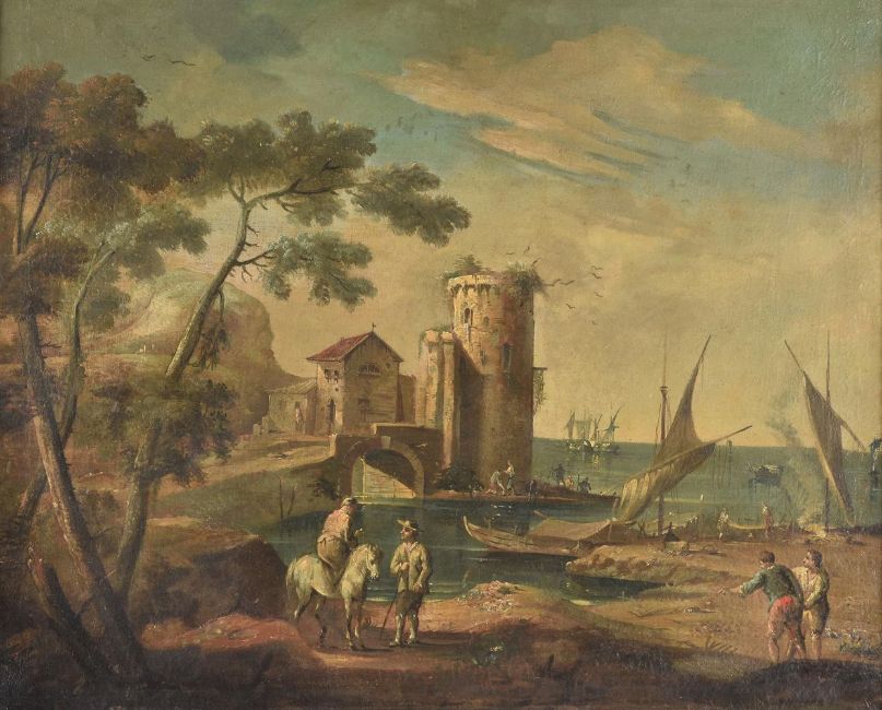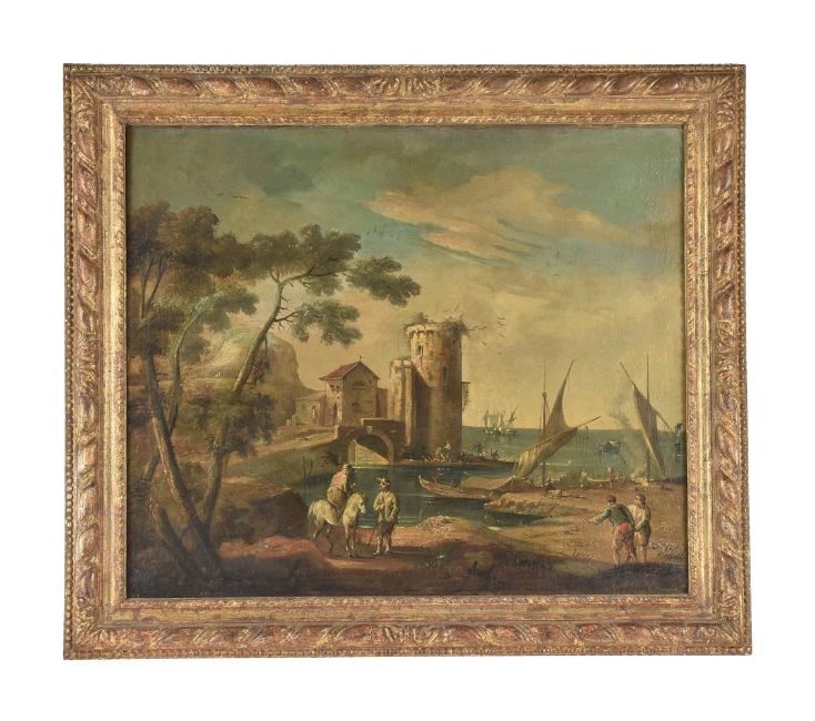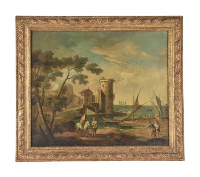 ITALIAN SCHOOL (18TH CENTURY)CAPRICCIO HARBOUR SCENE WITH FIGURES ALONG THE SHOREOil on canvas74 x 86cm (29 x 33¾ in.)