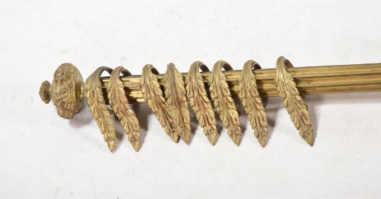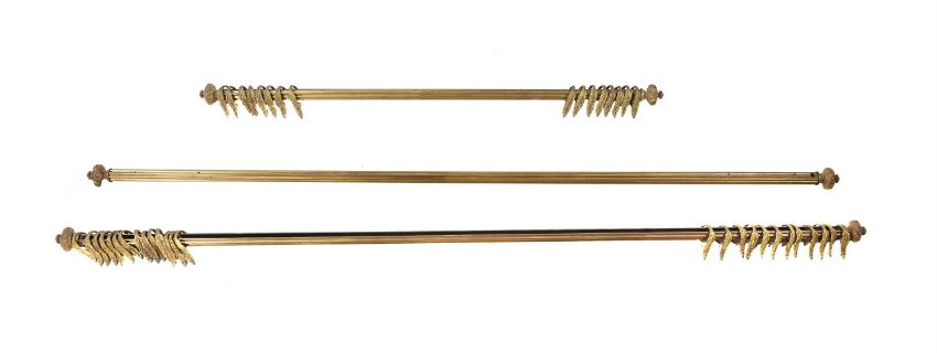 A SUITE OF THREE BRASS CURTAIN POLESLATE 19TH CENTURY, ALMOST CERTAINLY FRENCHOf differing lengths, all with a fluted shaft and stylised crown terminalsApproximately 300cm long and smaller Provenance: The Fulwood Collection