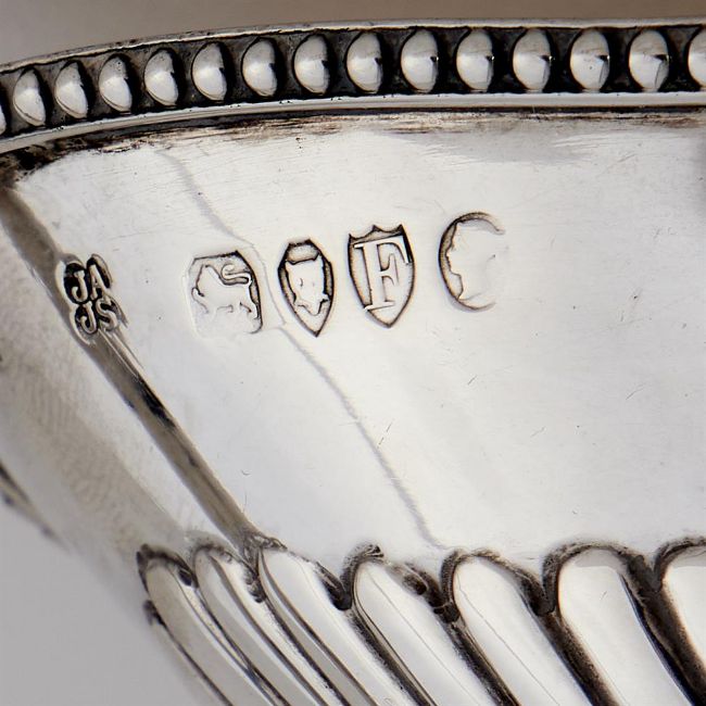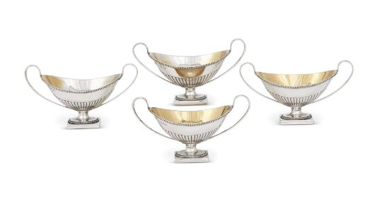 A SET OF FOUR VICTORIAN SILVER NAVETTE SHAPED SALTS HOLLAND, SON & SLATER, LONDON 1881 With twin loop handles, beaded borders, half lobed bodies and on rectangular pedestal bases 13.5cm (5 1/4in) long281g (9.05 oz)  Provenance: The Baring Family, Barons Ashburton, The Grange, Northington, Hampshire, thence by descent
