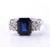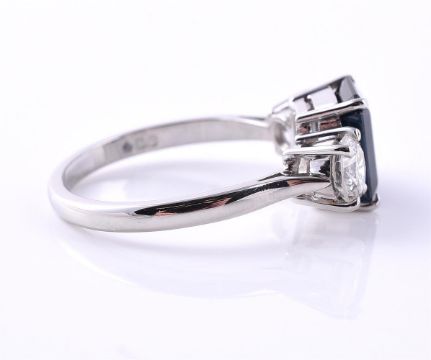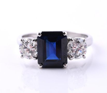 A DIAMOND AND SAPPHIRE THREE STONE RING The central step cut sapphire with canted corners, flanked between two brilliant cut diamonds in four claw settings, approximately 1.00 carats total, platinum 1977 hallmark Size/dimensions: finger size O 1/2 Gross weight: 5.2 grams Condition Report: Some light wear, the diamonds are bright and lively, colour H-I, clarity VS-SI1, small inclusion under the crown facets. Condition Report Disclaimer
