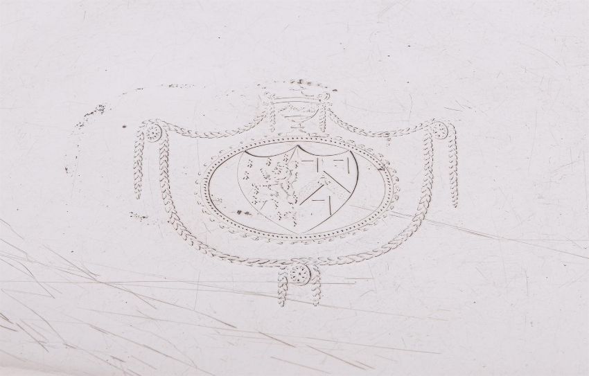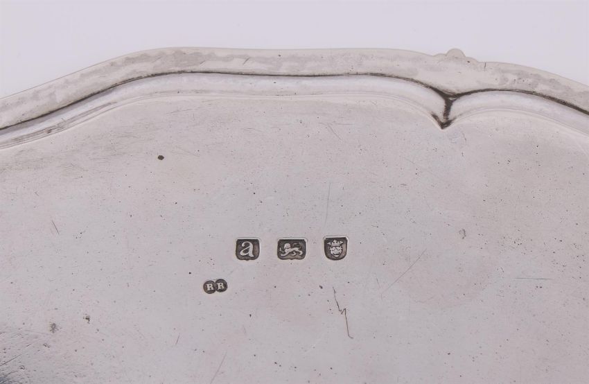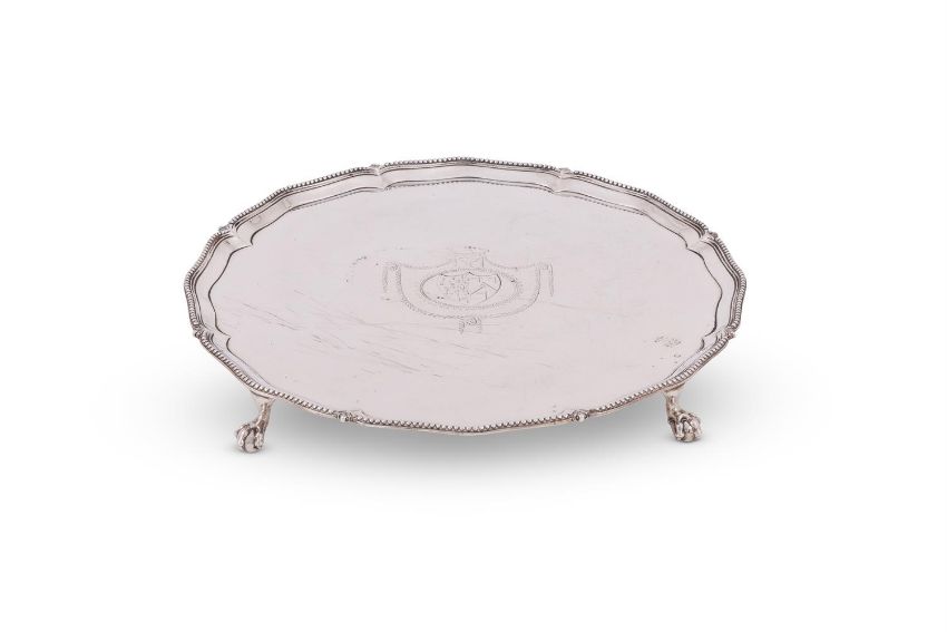 A GEORGE III SILVER SHAPED CIRCULAR SALVER RICHARD RUGG II, LONDON 1772 With beaded border, engraved with an armorial and on four ball and claw feet 36cm (14in) diameter 1418g (45.6 oz) Condition Report: Marks are clearWarpedWobbles badlyEngraving rubbedLight scratches and wear commensurate with age and useCondition Report Disclaimer