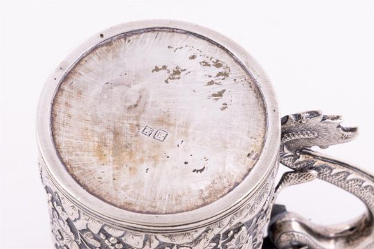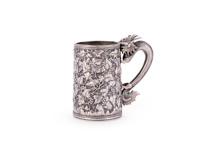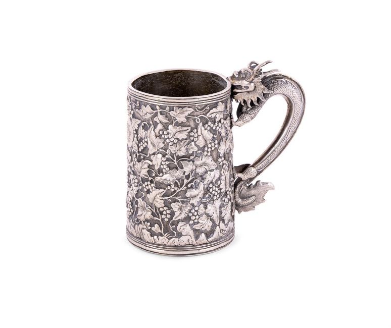 A CHINESE SILVER EXPORT MUG MARKS OBSCURED With a dragon scroll handle, chased with grape vine decoration and engraved with a monogram within a circular reserve 11.5cm (4 1/2in) high 199g (6.4 oz) Condition Report: The right hand front leg of the dragon is completely missing.Condition Report Disclaimer