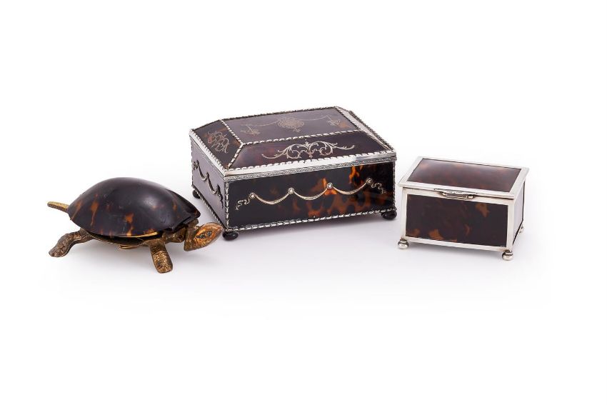 Y THREE TORTOISESHELL MOUNTED ITEMS To include: a silver and tortoiseshell mounted box and cover by Grey & Co., Chester, 1912, on four ball feet, 9.5cm (3 3/4in) long; an Edwardian silver mounted and tortoiseshell mounted box and cover, William Comyns, London 1905, with a husk border, inlaid with foliate swags, bows and musical instruments, on four bun feet, 15cm (6in) long; and a white metal and tortoiseshell mounted table bell, in the form of a tortoise, 18cm (7in) long Condition Report: Grey & Son - Marks are clear, stands well, hinge good, cover sits well, gap to back edge, scratch to the coverWilliam Comyns - Marks are partially obscured, wobbles, hinge clear, cover sits well, pierced holes to the husk border, interior base marked and frayingTable bell - Slightly wobbles, mechanism functioning, scuffs to the tortoiseshellAll with light scratches and wear commensurate with age and useCondition Report Disclaimer