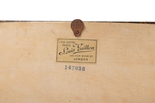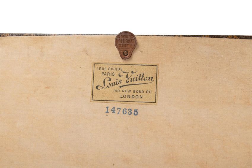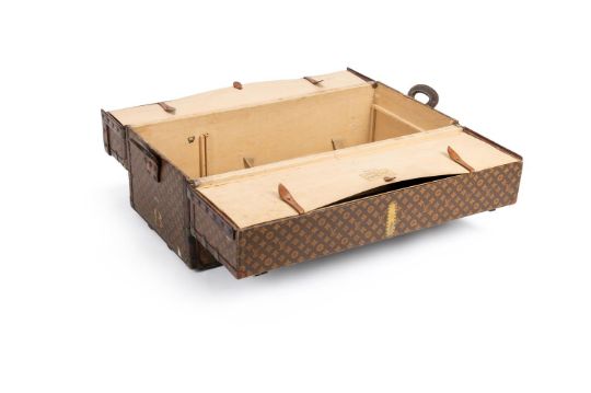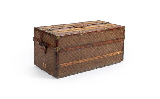 LOUIS VUITTON A MONOGRAMMED COATED CANVAS HARD TRAVELLING TRUNK, NO. 147635, 20TH CENTURY With leather and brass trim, wood slats, two leather loop handles, key and flip lock clasps, leather clasp cover, the sides painted with a coronet above B and on four wheels, opening to a cream canvas interior with lidded compartments inside the covers and three straps 100 x 49 x 46cm Condition Report: Scuffs and heavy wear to the leather trim and coated canvasWear to the wood slatsKnocks to the metal wear No keyCreases along the two hinge linesInterior stained and dirtyLids to interior bowedTwo drilled holes to the coverPainting rubbedLight to heavy wear commensurate with age and useCondition Report Disclaimer