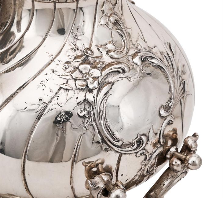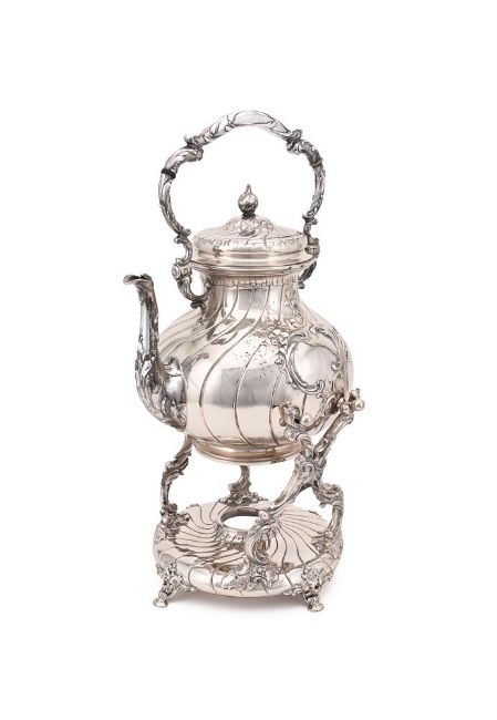 A GERMAN SILVER BALUSTER KETTLE ON AN ASSOCIATED SILVER STAND H. SCHAPER, STAMPED 800, BERLIN CIRCA 1900, THE STAND UNMARKED The C-scroll loop handle with composition warming bands, with a domed cover, the wrythen body embossed with flowers and foliage, and a vacant reserve, on a silver coloured stand with scroll supports and on four shell feet 47cm (18 1/2in) high 2619g (84.2 oz) gross Condition Report: Kettle - Marks to base clear, finial detached, play to the hinge and handle, cover sits well, no engraving, stands wellStand - Unmarked, tests as silver, wobbles, no engravingBoth with light scratches and wear commensurate with age and use Condition Report Disclaimer
