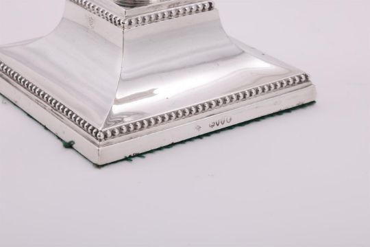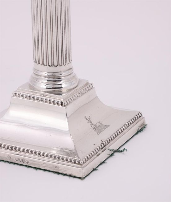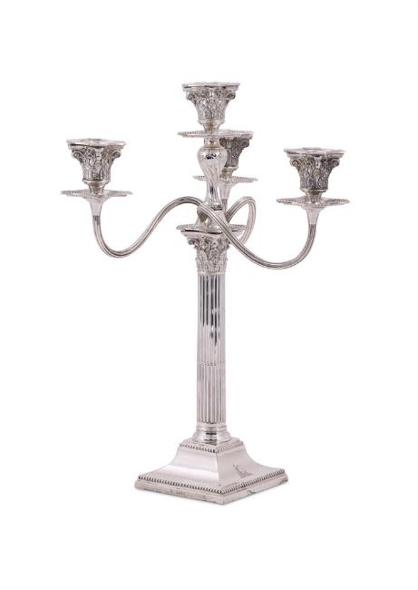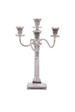 A VICTORIAN SILVER FOUR LIGHT CANDELABRUM MARTIN, HALL & CO., LONDON 1886 With four beaded sconces, chased acanthus leaf capitals, three scroll arms, tapering fluted and lobed stem, on a beaded square base and engraved with a crest 44.5cm (17 1/2in) high 872g (28.05 oz) weighable Condition Report: Maker's mark to base partially obscured, rest clearSlightly wobblesSconces fit tightly to the capitalsCrest clearStands trueLight scratches and wear commensurate with age and useCondition Report Disclaimer