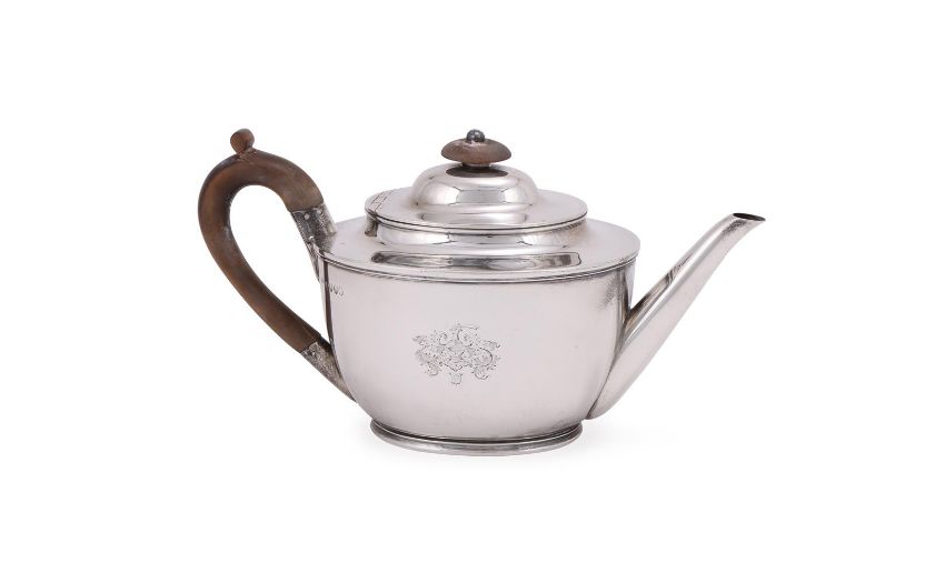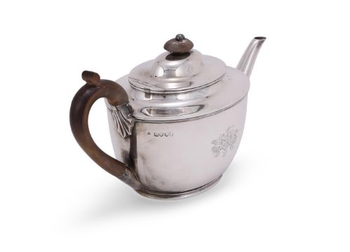 A VICTORIAN SILVER OVAL TEA POT F. B. THOMAS & CO., LONDON 1886 With an oval wooden finial and loop handle, and engraved with an armorial 27.5cm (10 3/4in) long 601g (19.35 oz) Condition Report: Marks lightly rubbedSlight play to the handleSlight lay to the hingeCover sits wellEngraving clearMinor knock to the foot rimLight dent to the bodyLight scratches and wear commensurate with age and useCondition Report Disclaimer
