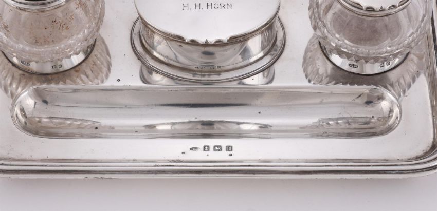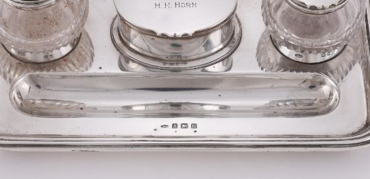 A SILVER OBLONG INKSTAND JOHN GRINSELL & SONS, BIRMINGHAM 1911 With a reeded border, two pen trays, an oval hinged compartment, engraved 'Srinagar 1923 Tennis Ladies Singles H. H. Horn', with two cut glass bottles with silver mounts, on four ball feet 26cm (10 1/4in) long 646g (20.8 oz) weighable Condition Report: Marks generally clearWobblesEngraving crispOne nut missing beneathHinges goodOne bottle with a ceramic inkwell that is stuck, so cover does not closeLight scratches and wear commensurate with age and useCondition Report Disclaimer