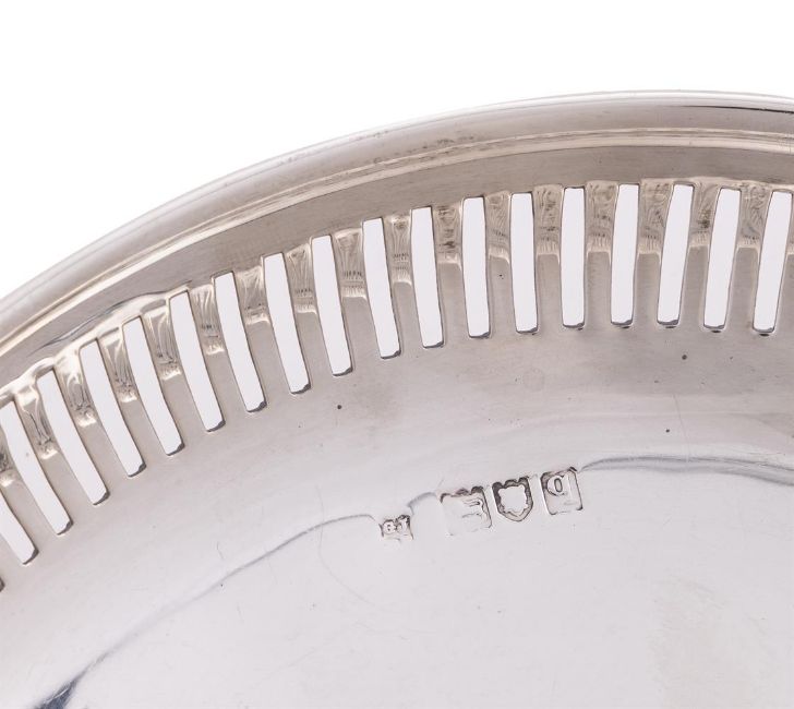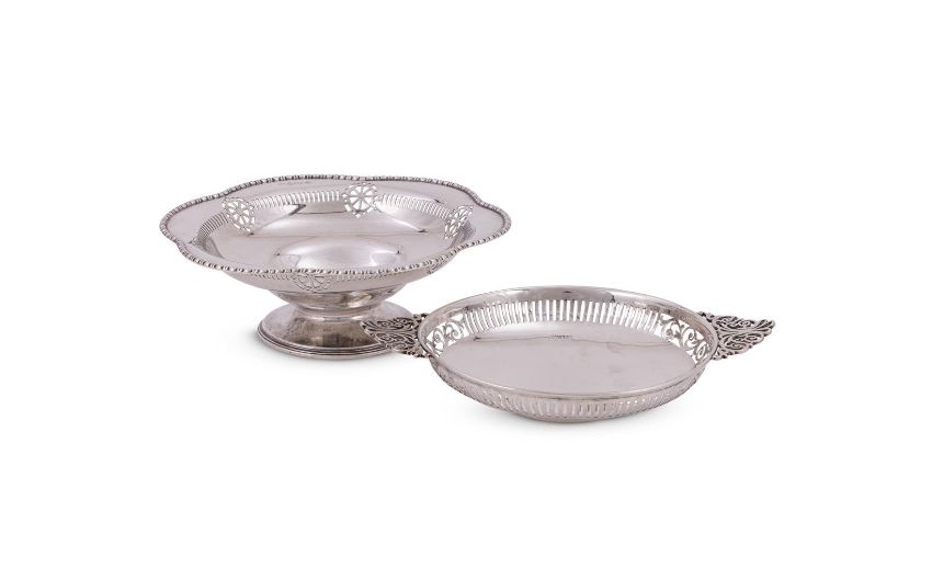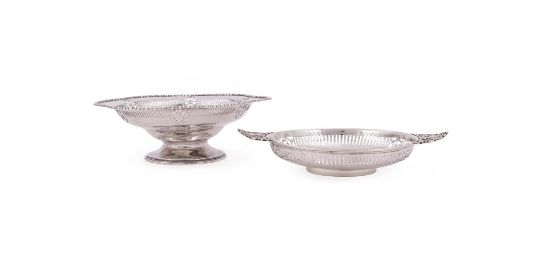 A SILVER SHAPED CIRCULAR PEDESTAL BOWL JAY, RICHARD ATTENBOROUGH CO. LTD., CHESTER 1913 With a bead and reel border, a pierced band and on a circular pedestal foot 21.5cm (8 1/2in) diameterTogether with a silver pierced twin handled pedestal dish by Josiah Williams & Co., London 1911, with twin pierced scrolled handles, a pierced foliate swag band and on a circular foot, 23cm (9in) long 549g (17.65 oz) gross