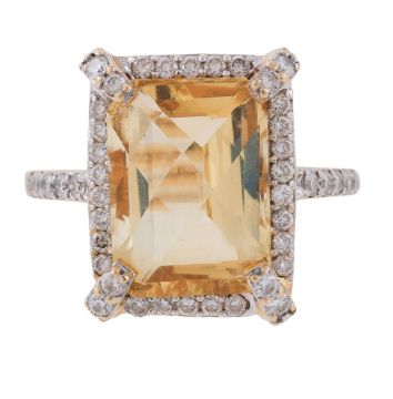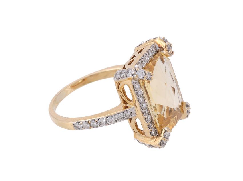 A CITRINE AND DIAMOND CLUSTER DRESS RING The mixed cut citrine within a surround of brilliant cut diamonds, with four brilliant cut diamond set claws, approximately 0.90 carats total, the polished gold coloured shank stamped 750 Size/dimensions: finger size P 1/2 Gross weight: 7 grams Condition Report: The citrine has chips under the claws, which isn't noticeable when worn, it is probably why the stone was chosen to have decorative claws to cover the chips, a couple of nicks to the crown. The diamonds are all present and correct, bright and lively. The shank has some very light wear, a couple of scuffsCondition Report Disclaimer