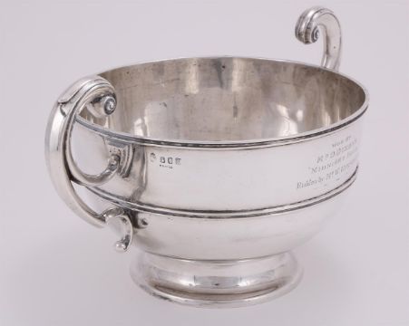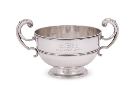 AN EDWARDIAN IRISH SILVER TWIN HANDLED TROPHY CUP SHARMAN D. NEIL, DUBLIN 1906 With twin flying scroll handles and a girdle, engraved 'North Down Harriers. Point to point races, 1909. Presented by the Officers 1st. Btn. Rifle Brigade.' and 'Won by Mr D. Dixon's Midnight Hour. Ridden by Mr W. Uprichard.', on a circular pedestal foot 35cm (13 3/4in) long 1241g (39.9 oz) Condition Report: Marks are clearSolder repair to one handle, can be seen inside the bowlEngraving clearStands wellMinor dent to the engravingLight scratches and wear commensurate with age and useCondition Report Disclaimer