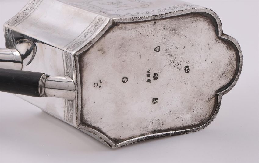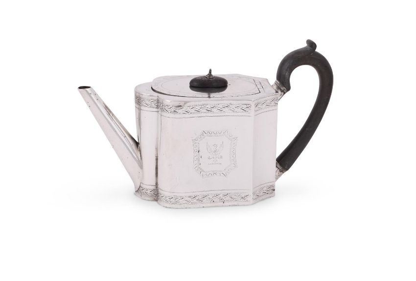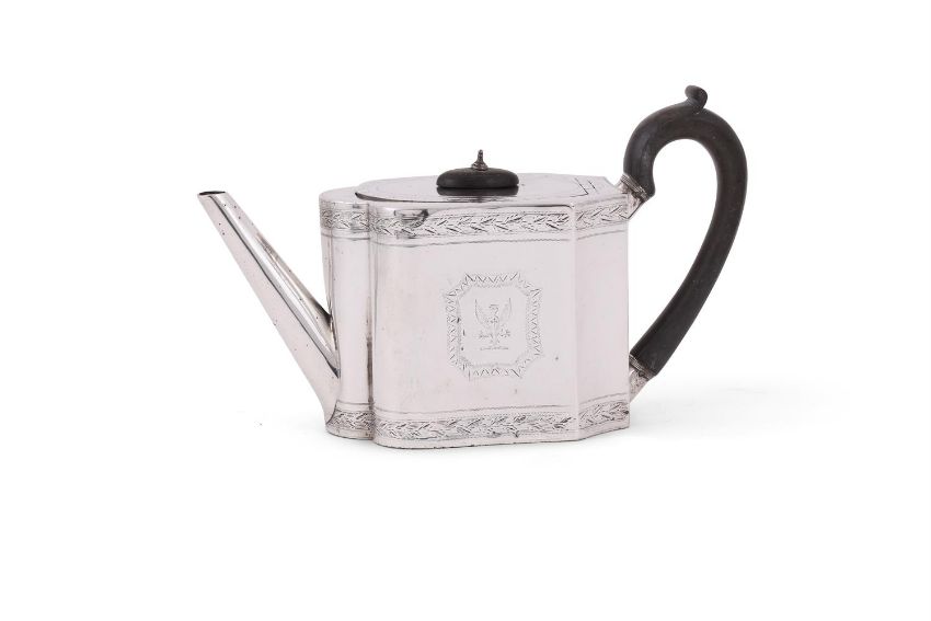 A VICTORIAN SILVER SHAPED RECTANGULAR TEAPOT WALTER & JOHN BARNARD, LONDON 1876 With a wooden oval finial and loop handle, engraved with two foliate bands and crests 24cm (9 1/2in) long 473g (15.2 oz) gross Provenance: From the Strachey Collection, Sutton Court, Somerset, by descent to the present owner Condition Report: Marks to the base clearPlay to the hingeGap to the coverEngraving lightly rubbed, heavier to the coverMinor creasesStands wellSlight play to the handleLight scratches and wear commensurate with age and useCondition Report Disclaimer