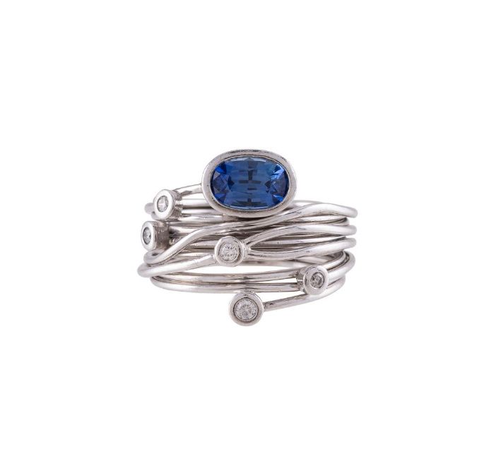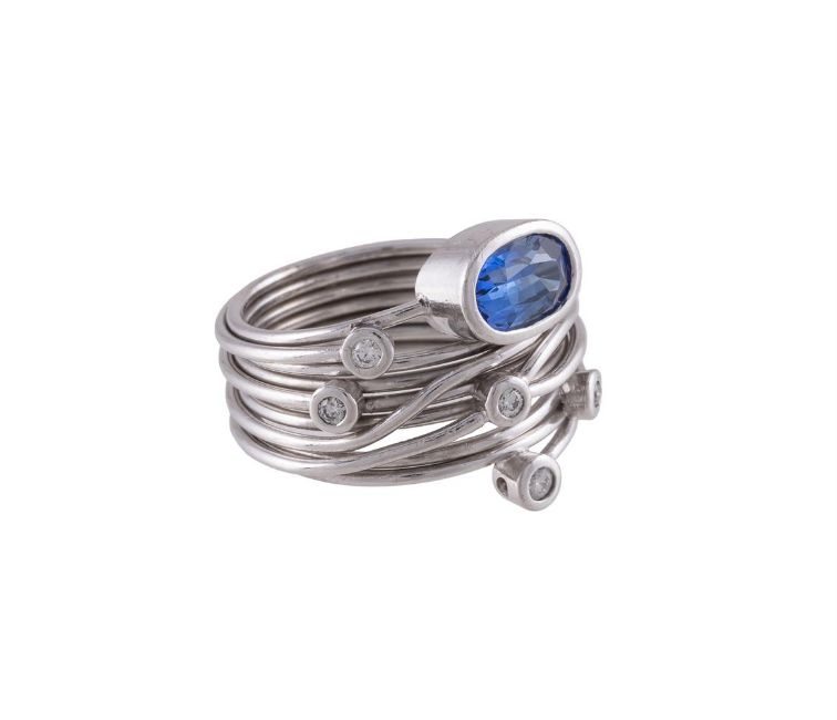 A SAPPHIRE AND DIAMOND DRESS RING The interwoven wire mount with an oval cut sapphire and collet set brilliant cut diamond accents, approximately 0.15 carats total, unmarked Size/dimensions: finger size N 1/2 Gross weight: 10 grams Condition Report: The sapphire and diamonds are all present and correct, there is some surface wear commensurate with age and use, a small section of the back of the shank has been abraded, possibly from previous acid testingThe sapphire measures 7.4mm x 5.3mm 3.75mm= approximately 1.18 carats Condition Report Disclaimer