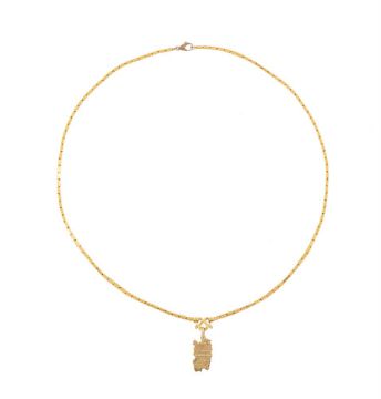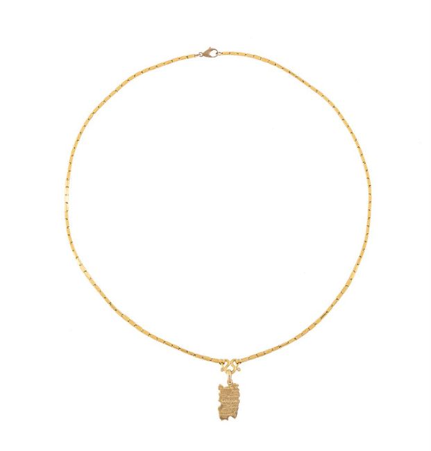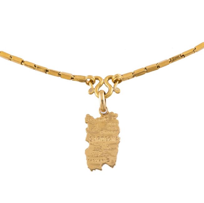 A GOLD COLOURED BOX LINK CHAIN The rectangular polished box links to a scrolled front section, stamped with rubbed marks, suspending an associated pendant of Sardinia stamped 750 with Italian control mark, associated lobster claw clasp Size/dimensions: necklace 52cm long Gross weight: 18 grams Condition Report: The chain is higher carat gold, the marks are rubbed, possibly Chinese marks. The later clasp is 9 carat gold. Condition Report Disclaimer