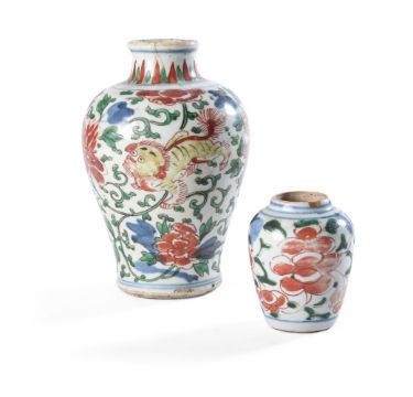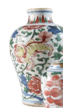 A FAMILLE VERTE VASE CHINESE, EARLY KANGXI painted with Buddhist lions 18cm highTogether withanother small vase painted with flowers 8.5cm high Condition Report: the larger vase with two x 3to 4cm hair cracks to rim and some wear to enamels the smaller vase with neck reduced and old gold lacquer repair to a rim chip and some wear to enamelsCondition Report Disclaimer
