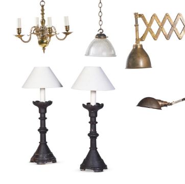 A SMALL BRASS CHANDELIER IN THE DUTCH 18TH CENTURY STYLE 20TH CENTURY 18.5cm high Together with a pair of Victorian gothic carved and painted wood lamp bases Circa 1870 In the manner of Butterfield 64.5cm high to top of shade An unusual telescopic table light Early 20th century 36.5cm high And a clip-on desk "Adjusto-Lite" light, and a single "Holophane" glass pendant shade Condition Report: Wear, marks, knocks and scratches as per age, handling, use, and cleaning. Pair of Butterfield style bases Sold with a portable appliance test (PAT) certificate July 2023. Both with losses to floral 'pans'- one with restored base- the other with cracked base. Crusty finish and some paint loss THE REMAINING ITEMS are sold as decorative items only, with plugs removed, and if bought for use must be checked over for compliance with safety regulations by a qualified electrician before use. Small brass chandelier- surface worn from handling and cleaning- wire tied to branches- nozzles and pans drilled Telescopic table light- surface dirty and tarnished. Lacks one pin to action Clip-on desk "Adjusto-Lite" light- surface dirty and tarnished. Some dents to shade Single glass pendant shade- marked Holophane France- generally good- metal fitment rubbed- Please see additional images for visual references to condition which form part of this condition report. All lots are offered for sale "as viewed" and subject to the applicable Conditions of Business for Buyer's condition, which are set out in the sale catalogue and are available on request. All lots are available for inspection and Condition Reports are available on request. However, all lots are of an age and type which means that they may not be in perfect condition and should be viewed by prospective bidders; please refer to Condition 6 of the Conditions of Business for Buyers. This is particularly true for garden related items. We must advise you that we are not professional restorers or conservators and we do not provide any guarantee or warranty as to a lot's condition. Accordingly, it is recommended that prospective buyers inspect lots or have their advisors do so and satisfy themselves as to condition and accuracy of description Buyers are reminded that liability for loss and damage transfers to the buyer from the fall of the hammer. Whilst the majority of lots will remain in their location until collected, we can accept no responsibility for any damage which may occur, even in the event of Dreweatts staff assisting carriers during collection. Condition Report Disclaimer
