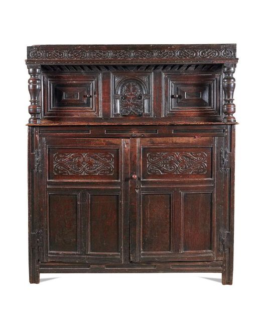 A WILLIAM AND MARY OAK COURT CUPBOARD SECOND HALF 17TH CENTURY 178cm high, 156cm wide, 60cm deepProvenance: Axel Vervoordt, Antwerp, Christie's, 10th - 12th May 2004, lot 446, where purchased by Robert Kime Condition Report: Marks, knocks, scratches, abrasions consistent with age and use Old splits and cracks, chips and lossesThe side panels to the upper section are detached but present, these are loose to the cabinet and will require some attention and repair before use in a domestic setting.Locks to the upper section have been removed, the lower lock is present but is a replacement, there is no key - the lock is presently engaged but the doors can be opened without. Signs of old woodworm, some filler, and signs of repairs to old holesSome signs of later replacement, some rear timber would appear to be replacements, some webbing and signs of old webbing from previous repairs to the back panel elements.Almost certainly had a cornice which has been lost/removed, the inner dental mouldings to the underside of the canopy are almost certainly later, It is quite possible this has been adapted and re-built previously with various period and later timbers, the turned balusters supporting the canopy over hang the base, these themselves have various splits and cracks, the treatment of the upper elements of these also appear to have variation.Please see additional images for visual reference to condition  Condition Report Disclaimer