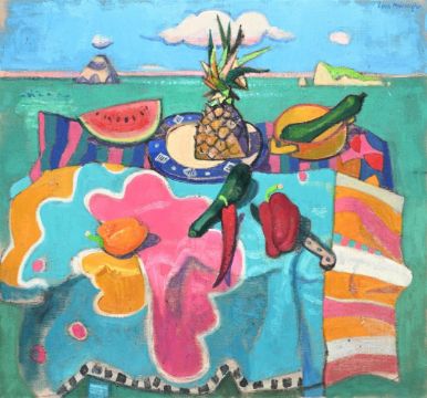 λ LEON MORROCCO (SCOTTISH B. 1942) SEA STILL LIFE WITH ISLANDS Oil on canvas Signed and dated '20 (upper right) 76 x 81cm (29¾ x 31¾ in.)Provenance: John Martin Gallery, London Condition Report: Very light surface dirt throughout some scattered areas of fluff stuck to the surface. Otherwise no obvious condition issues.  Condition Report Disclaimer