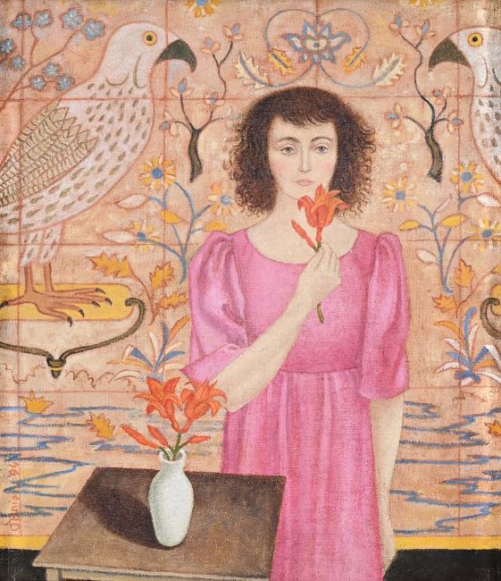 λ PATRICIA O'BRIEN (IRISH B. 1927) BIRDS OF PREY Oil on canvas Signed and dated '94 (lower left); titled to frame (verso) 36 x 31cm (14 x 12 in.)Patricia O'Brien's artistic journey took off in 1977 when she first exhibited her work at the Upper Street Gallery in London. This initial exhibition marked the beginning of a flourishing career that would see her gain representation by Stephen Bartley and participate in numerous international exhibitions. From 1981, O'Brien's talent and unique artistic vision caught the attention of the Royal Academy. She participated in the prestigious Royal Academy Summer Exhibition, a renowned annual event that showcases the best of contemporary art. John Russell Taylor, an esteemed critic, hailed O'Brien as an "out-and-out discovery" in his review of the 1989 Royal Academy Summer Show. In a remarkable testament to the impact of her work, O'Brien's painting titled "The Fruit Eaters" became the main promotional press image for the Royal Academy Summer Show in 1990. Throughout Patricia O'Brien's body of work, the female figure takes centre stage, becoming a focal point of her compositions. O'Brien delves into the complexities of human relationships, exploring their dynamics, inviting viewers to interpret and question the narratives presented. O'Brien repeatedly portrays three figures, possibly a connotation to her own complicated relationships. Her works exude an intense visual poetry, compelling viewers to unravel the stories behind each character and scene portrayed on the canvas. O'Brien creates a sense of stillness in her work, capturing a fleeting moment suspended in time whether that be taking a lesson (Lot 96), eating fruit (Lot 98) or purchasing flowers at the market (Lot 100). There is a mystical and disquieting quality to her pieces, evoking a sense of melancholy that adds depth and complexity to the overall atmosphere. The deliberate absence of traditional perspective in O'Brien's work contributes to her distinctive style, along with a subdued colour palette and meticulous composition of objects and figures within the surrealist landscapes. These elements make O'Brien's art instantly recognisable and draw the viewer into a world of carefully constructed beauty.In 1972, Patricia O'Brien made the decision to settle down in the perfume capital of France, Grasse. Drawn to the allure of its mountainous landscapes and expansive vistas, these majestic surroundings served as a prominent influence in her work, providing the backdrop against which her pensive figures would come to life as can be seen in lot 98 and 99. It was during her time in France that she forged a close friendship with Frederick Gore, a fellow artist.Patricia O'Brien's artwork is a captivating blend of surrealist iconography and Renaissance influences, creating a unique and distinctive style. O'Brien was especially drawn to fifteenth century Italian artists such as Sandro Botticelli and Piero della Francesca whose focus on exquisite attention to detail, with a particular emphasis on depicting the human form with individuality, empathy, and sensitivity, inspired her. Humanism permeates O'Brien's work, as she delves deep into the layers of emotions experienced by her figures and situates them within the natural world, infusing her paintings with spiritual meaning. One striking aspect of O'Brien's paintings is the luminous complexion and porcelain skin of her figures particularly apparent in Lot 99 which shows three female nudes attending to flowers beneath the mountainous landscape beyond. Condition Report: In good original condition. Condition Report Disclaimer