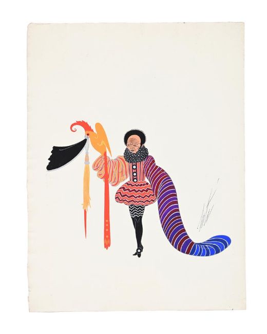 λ  ERTÉ (FRENCH 1892-1990) LA FEMME ET LE DIABLE: UN NAIN DE L'ESPAGNOLE Gouache and silver paint Signed (lower right), stamped with studio stamp and titled (verso) 39 x 29cm (15¼ x 11¼ in.) UnframedProvenance: Acquired directly from the artist and by descentThe proceeds from this collection of works by Erte will be donated to:Southbank Sinfonia, Grange Park Opera and Little Angel Theatre, Islington. Please visit our website for more information on these charities. Erté, a name synonymous with beauty, elegance, and innovation, stands as an icon in the world of 20th Century design, theatre, and fashion. Born Romain de Tirtoff in 1892 in St Petersburg, Russia, he moved to Paris in 1910 to pursue his dream of becoming an artist. His father, an Admiral in the Imperial fleet had wanted his only son to follow the family's naval tradition. In order to avoid the perceived shame to the family name he became known by his nickname, Erté, which was derived from the French pronunciation of his initials.Once in Paris he quickly found employment with the highly respected Parisian Couturier Paul Poiret and in 1915 Erté started supplying the fashion magazine Harper's Bazaar with illustrations and designs. This relationship would continue for the next twenty years and included an incredible 240 illustrated covers.His work for Harper's Bazaar brought him international acclaim and in 1925 he started working with many Hollywood producers, designing the sets and costumes. He is however most revered for his work with Parisian theatres, including the FoliesBergère, Bal Tabarin and Le Lido. Through his iconic fashion designs, illustrations, and theatrical costumes, Erté's legacy continues to inspire and captivate a century on, bringing timeless glamour and elegance to the present day.