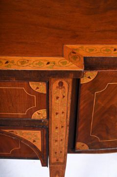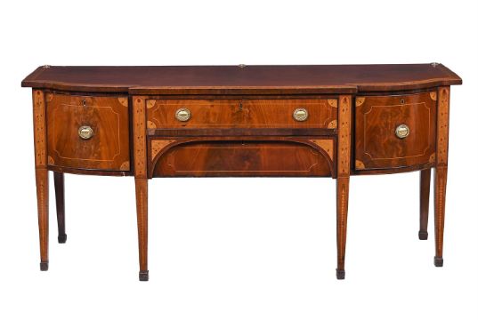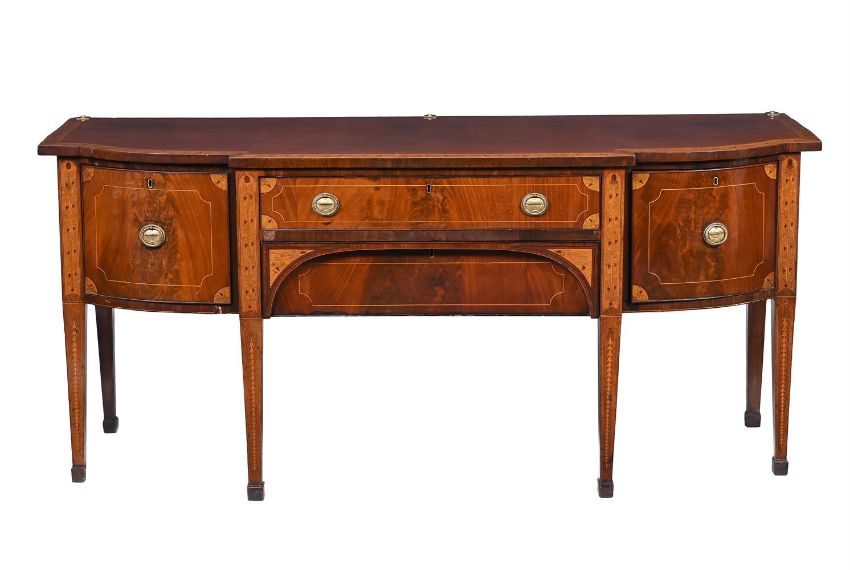 A GEORGE III MAHOGANY, SATINWOOD BANDED, AND INLAID SIDEBOARD CIRCA 1790 92cm high, 203cm wide, 70cm deep Condition Report: Marks, knocks, scratches, abrasions consistent with age and use, old splits and cracks, chips, losses, some replacement to veneersThis would have had a rail to the back, this is not present (and never has been at Dreweatts) the securing mounts are attached to the rear - these have dirt and discolourationHandles are probably not original, one deep drawer with hardboard to the inside to secure the handle, the handles appear to occupy the original holesOverall appears solid and stablePlease see additional images for visual reference to condition Condition Report Disclaimer