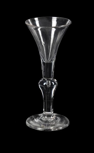 A BALUSTER WINE GLASS OF SO-CALLED 'KIT KAT' TYPE SECOND QUARTER 18TH CENTURY The drawn trumpet bowl with solid lower section supported on an inverted baluster and conical foot, 17.5cm high Provenance: From a deceased private collection. Condition Report: Bowl = 7.5cm diamFoot = 7.5cm diam.Small foreign body in the bowl, some wear to the underside of the foot.Condition Report Disclaimer